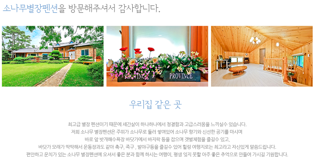 상호 : 소나무 별장펜션 | 대표자명 : 문경숙 | 사업자등록번호 : 502-45-980731 | 계좌번호 : 농협 302-1099-6753-31 주소 : 충남 태안군 안면읍 해안관광로 276-1 (구. 안면읍 승언리 1942)ㅣ연락처 : 010-8474-3384 / 010-6252-3384